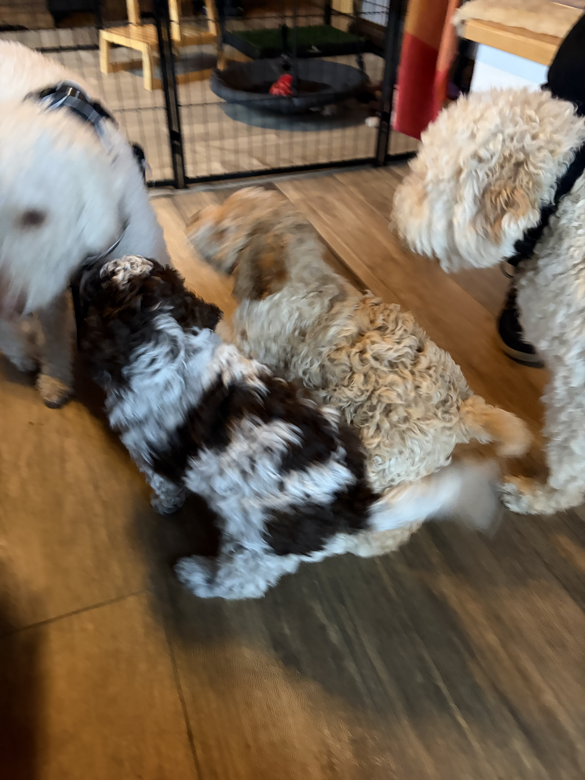 Nach einem ereignisreichen Samstag (Social Walk – Lotta in Freifolge und im Freilauf am Deich) gestern Besuch in Au – Lagöttchen anschauen. Vier super-süße kleine Mäuse, einer frecher als der andere und schon mit kleinen spitzen Zähnchen, die alles und alle erkunden. Lotta wars dann aber irgendwann zuviel und sie hat sich zu Anne und mir unter den Tisch verzogen nachdem sie vorher noch eine Runde mit Zora und Alba im Garten gedreht hatte. Der kleine Yorkshire-Rüde hatte aber ziemliches Interesse an Lottas Hinterteil – da scheint irgendwas immer noch sehr gut zu riechen … schon komisch dass das nicht mal langsam aufhört. Wenn alles klappt und Alba dann irgendwann im Herbst nächstes Jahr Mama wird gibt es gegen Weihnachten 2026 ein weiteres Mädchen bei uns … mal schauen ob das klappt … Wäre schon schön nochmal eine Welpin von Anfang an zu haben …
